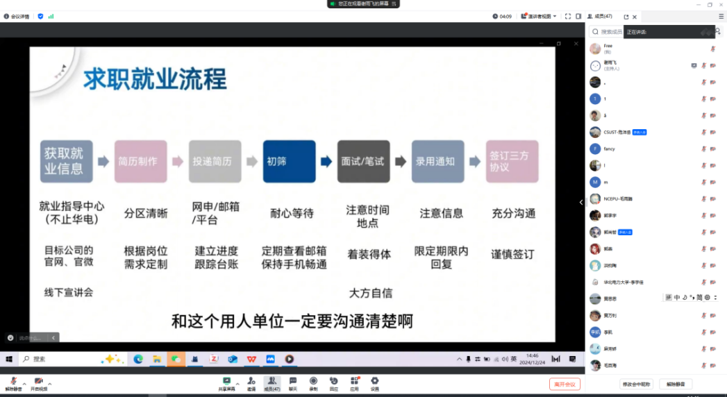 2024届硕士毕业生卢姣阳从职业发展方向的选择,面试和简历的准备,工作信息差的获取,以及自身对就业的感悟等方面向同学们分享了自己的体会和经验。