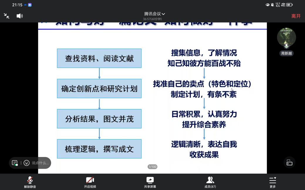 周新越,现就读于新能源学院博新能源2165班,获得国家奖学金、优秀博士奖学金。她从“科技论文、竞赛和会议、社会交流会”三个方面引导同学们如何平衡科研与生活。她表示,卓越的科研成就来自条理清晰的研究思路:以文献阅读掌握研究现状,以精确找准创新点打开局面,加之以逻辑通顺的成文结构和图文并茂的数据分析,才能生成一篇高水平有价值的好文章。另外,她鼓励大家让社会交流会成为学术生活的添加剂,培养自己待人接物的能力,并学会调节心态,坦然面对挫折。