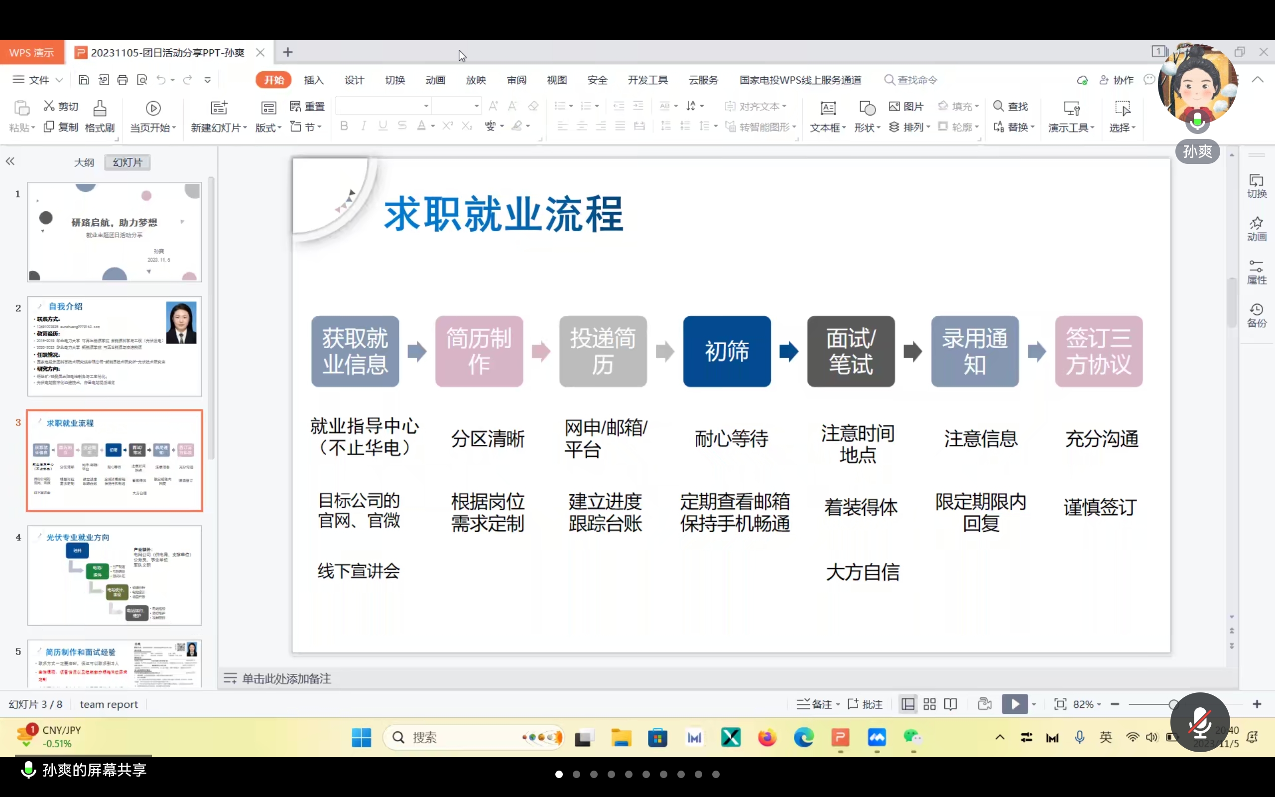 孙爽,现就职于国家电投集团科学技术研究院,曾任研新能源2042班班长,校“蓝色动力合唱团”成员。她聚焦求职流程,详细阐释“获取就业信息—简历制作—投递简历—初筛—面试/笔试—录用通知—签订三方协议”中各个环节需要了解的平台、准备的资料,指导同学们学会打破信息差,找到称心如意的工作。此外,她还介绍了光伏产业的就业形势。她将“切忌一份简历走天下”的忠告穿插整个过程中,强调了根据目标岗位量身定制工作素养的思维能力。