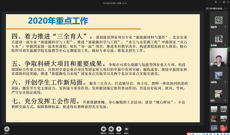 根据学校党委关于2019年度处级领导班子及处级干部考核工作的安排,3月10日下午,我院通过企业微信视频会议召开了2019年度处级领导班子、处级干部考核会,会议由学院党委书记刘永前主持,学院领导及全体教职工参加了会议。
