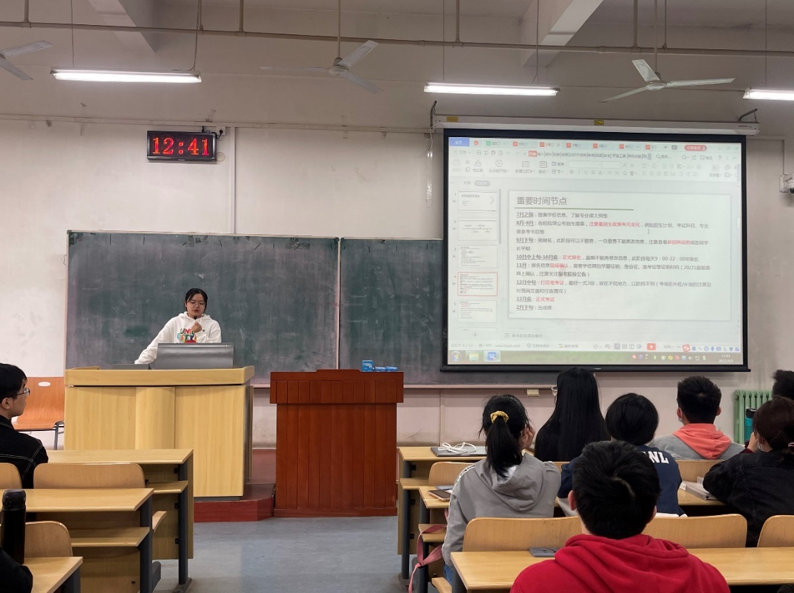 接下来,2017级学长学姐分别为我们介绍了相关去向经验。能科1701班刘宇璐介绍了本校考研的相关经验,从考研基本信息、个人考研情况、考研时间安排和注意事项展开,讲解了学硕与专硕的区别、重要时间节点如何进行准备、考研信息收集的渠道和方法、个人考研情况等内容,使同学们对校内考研这一方向有了具体认识。