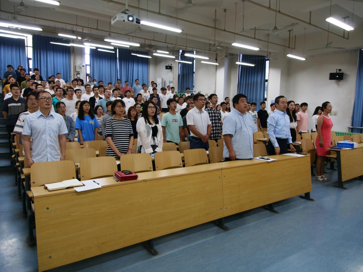 会议伊始,全体师生起立,奏唱国歌。