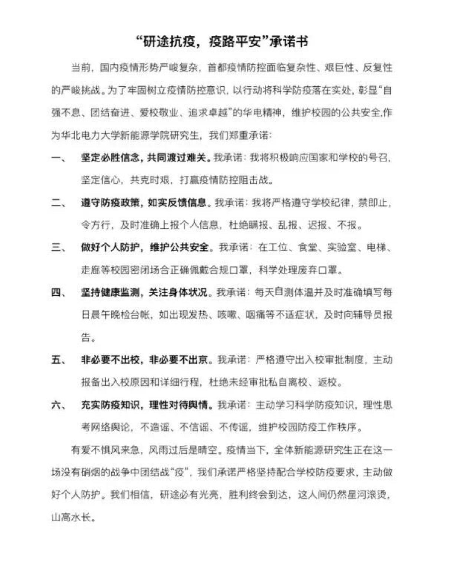 学生骨干提高政治站位,争做科学防疫“先行人”,积极响应学院各项疫情防控工作部署,主动加强班级同学思想动态摸排调研,了解学生思想困惑,突出人文关怀,引导学生树立新时代大学生责任感和使命感,杜绝虚假和不良舆论散播,通过带头签署“新能源学院疫情防控承诺书”和拍摄《关于我“罩”顾好自己这件事》、《研途抗疫、疫路平安》等微视频,号召全院学生科学防疫、同舟共济,坚定打赢疫情防控阻击战的信念和决心。