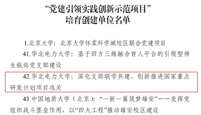 近日,北京市委教育工委发布了《关于公布北京高校党建工作“标杆院系”“样板支部”“党建引领实践创新示范项目”培育创建单位名单的通知》(京教工〔2024〕47号),我校共有11个项目入选,其中我院风力发电研究中心党支部入选北京高校党建工作“样板支部”培育创建单位名单,我院智能风电场实验室研究生党支部申报的“深化支部联学共建,创新推进国家重点研发计划项目攻关”项目入选“党建引领实践创新示范项目”培育创建单位名单。