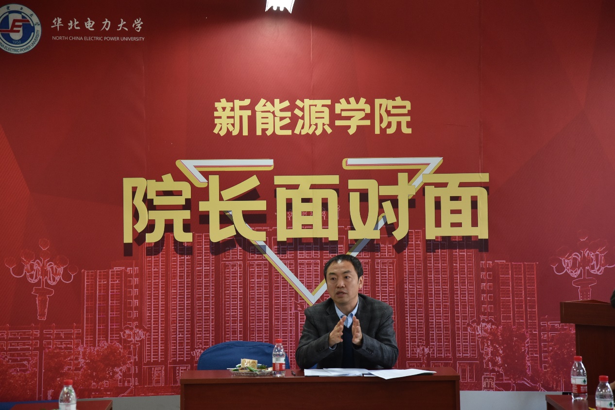 2020年11月24日下午,新能源学院首期“院长面对面”活动在主楼B606举行。本次活动的主题是“以本为本,四个回归”,本期活动主要面向在读的本科生。为了使学生更深刻地理解学院的育人理念和各专业的学习特点,提高学生学习的主动性和积极性,进一步拉进学院与学生之间的距离,组织开展了本次面对面交流。活动由新能源学院院长李美成进行主讲,参加的学生来自学院各个本科年级,党委副书记姜良杰、副院长葛铭纬、生物质中心主任董长青、太阳能教研室主任许佳、生物质教研室主任高攀、教授代表刘永前、马俊峰共同参与交流讨论。