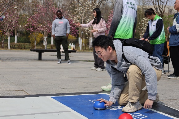 本次趣味运动会设置了多项富有创意和趣味性的比赛项目,吸引了众多师生驻足观战。在扔沙包项目中,运动员们在规定的距离内投向目标;趣味冰壶项目展示了一场“团队合作的博弈”;摸石过河项目考验了运动员的平衡感和前瞻性;乒乓球接力传展现了同学们的运动技能与团队协作能力;九宫三子棋更是智力与策略的较量。场外,志愿者们手持“能源报国”和“强身健体”的主题标语,为赛事提供了周到的服务,以实际行动诠释新能源学院的专业特色与报国情怀。