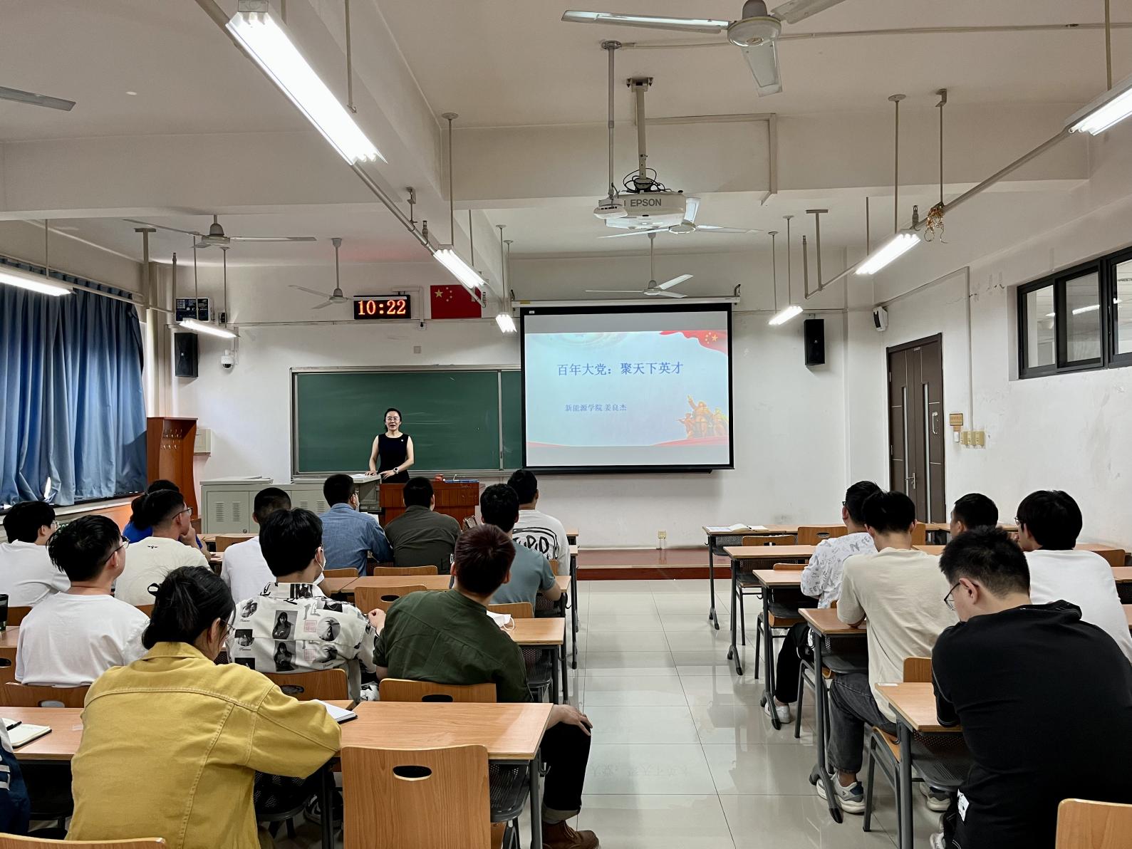 为深入开展学习贯彻习近平新时代中国特色社会主义思想主题教育,引领带动基层党组织和广大学生党员在以学铸魂、以学增智、以学正风、以学促干方面取得实实在在的成效,5月23日,新能源学院党委副书记姜良杰在主楼B411为全体研究生班长和党支书讲授题为“百年大党:聚天下之英才”的专题党课。