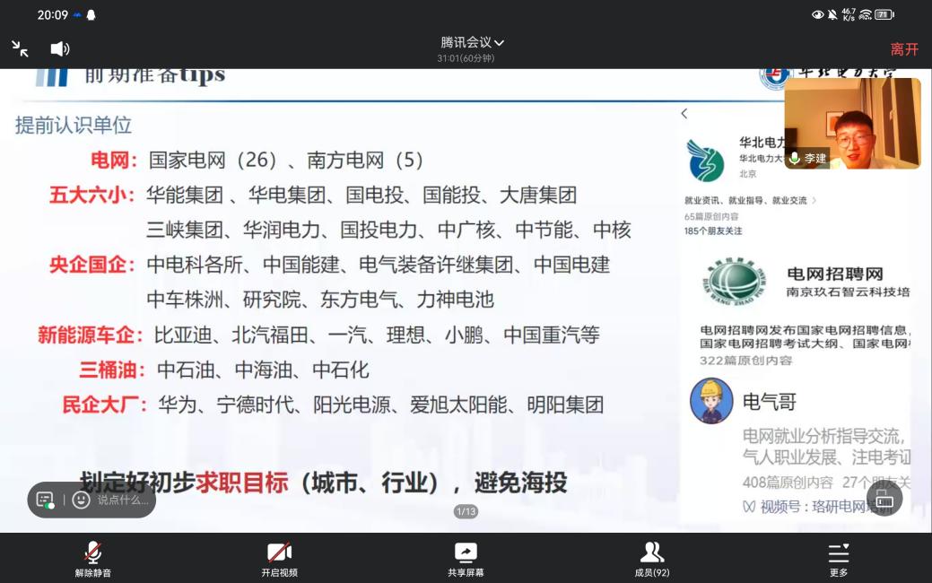 李建,现就职于华为数字能源,曾任新能源学院研究生会主席。他从“认识工作单位、锁定就业目标、熟悉面试内容、日常培养能力”多方面出发,介绍了适合本院学生就业去向的各行各业公司,为大家讲解如何描绘属于自己的就业蓝图,希望大家充分利用三年读研时光靶向提升就业需要的专业素养。同时,他还重点介绍了华为数字能源BD的面试流程及加分技巧,提供了更多就业实用信息。