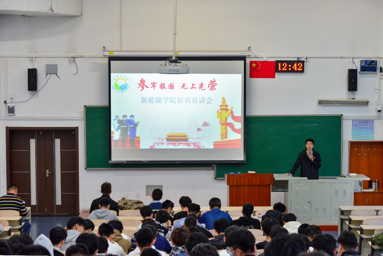 为深入学习宣传贯彻习近平强军思想,进一步做好征兵政策宣传,激发我院学子参军入伍积极性,推动国防和军队现代化建设,4月14日新能源学院召开2023年度征兵宣传动员大会,会议由2020级辅导员杨子发主持,邀请学校党委武装部魏天雨老师做征兵政策解读,邓旺旺、热夏提·吾斯曼江两位退役大学生士兵做交流分享,全体2022级本科生参会。