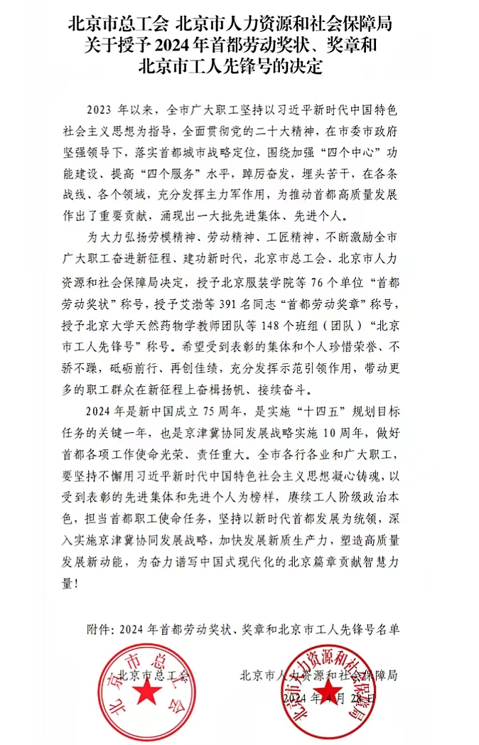 4月28日,由北京市总工会、北京市人力资源和社会保障局联合举办的2024年首都劳动奖状、奖章和北京市工人先锋号评选结果揭晓,我院生物质清洁转化与利用教师团队获评北京市“工人先锋号”。