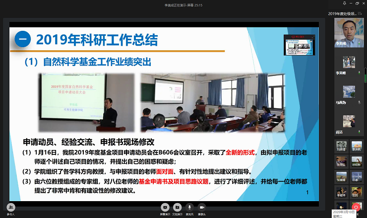 根据学校党委关于2019年度处级领导班子及处级干部考核工作的安排,3月10日下午,我院通过企业微信视频会议召开了2019年度处级领导班子、处级干部考核会,会议由学院党委书记刘永前主持,学院领导及全体教职工参加了会议。