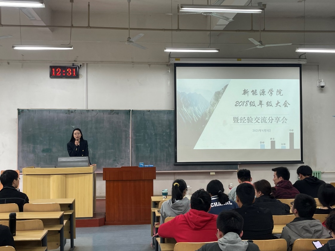 为加强新能源学院学风建设,营造升学深造氛围,帮助学生全方位、多层次了解考研、保研、就业、出国等多途径升学流程及注意事项,调动学生积极充分发挥自身学习成绩、兴趣爱好、科研成果等方面的优势,提前规划毕业选择,新能源学院于2021年4月9日中午12时30分,召开2018级年级大会暨经验交流分享会,会议邀请2017级已通过考研、保研,成功就业、出国的七位学长学姐为同学们做分享。本次会议由2018级辅导员王轩老师主持。