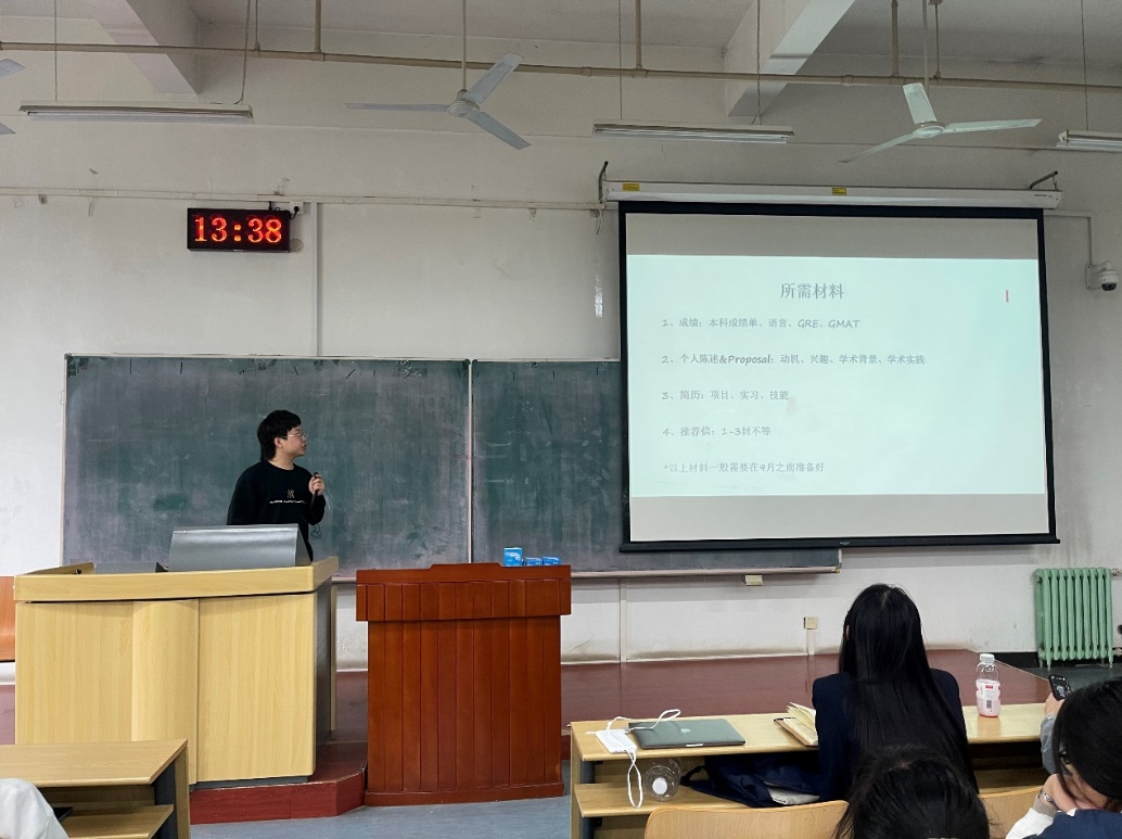 最后,能材1701班的王孙悦向大家介绍了就业的相关经验。王孙悦以幽默风趣的语言从选择就业、制作简历的注意事项、招聘公告-宣讲会的准备、面试的注意事项和小技巧、签约时如何应对各种几个方向进行介绍。同学们在欢声笑语中对就业方面的问题有了具体生动的认识。能科1702班的张嘉豪学长介绍了出国留学的相关经验。从出国所需材料、如何准备及准备时间、所申请学位类型的特点、不同国家(地区)的显著差异、海外硕士的优势和劣势、中介和DIY申请的优势劣势几个方面进行了详细的讲解,为同学们开辟了新的视野,提供了另一种规划路线。随着张嘉豪学长的讲解结束,大会也到了尾声。