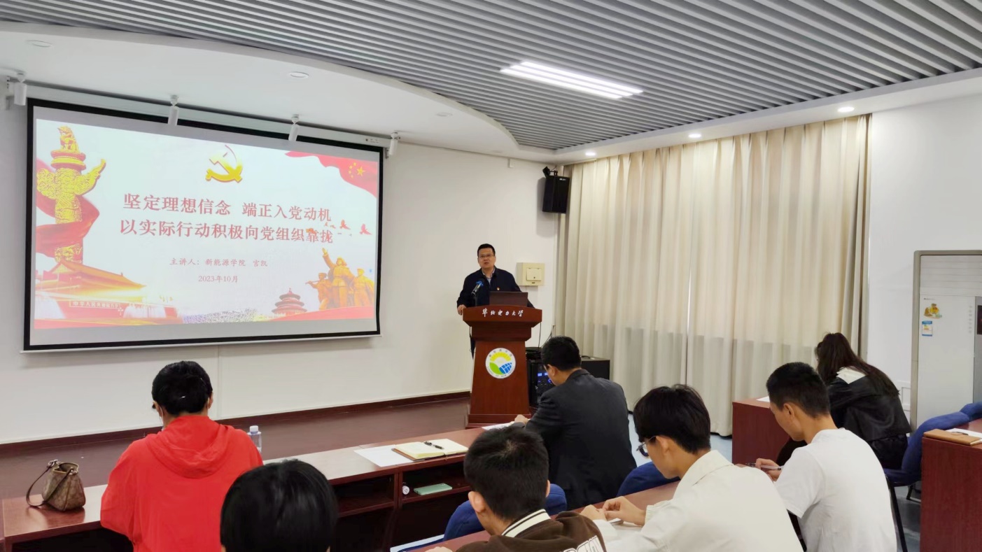 学院党委书记宫凯为培训班学员带来了主题为《坚定理想信念,端正入党动机,以实际行动积极向党组织靠拢》的第一堂党课。他首先阐释了“什么是入党动机”,“什么是正确的入党动机”;接着指明“为什么要端正入党动机”,“怎样端正入党动机”;然后以“习近平总书记的入党之路”为例,强调了正确的入党动机对党员始终保持先进性的重要作用;最后他要求培训班学员切实端正入党动机,认真学习党的二十大精神,用党员标准严格要求自己,坚持做到“四个统一”,积极参加学校学院组织的各项活动,做好身边小事,在日常学习生活中展现入党积极分子的先进性,以实际行动入党。他还鼓励学员们将个人发展与新能源行业的发展同频共振,为国家“双碳”目标的推进贡献华电新能源人的力量。