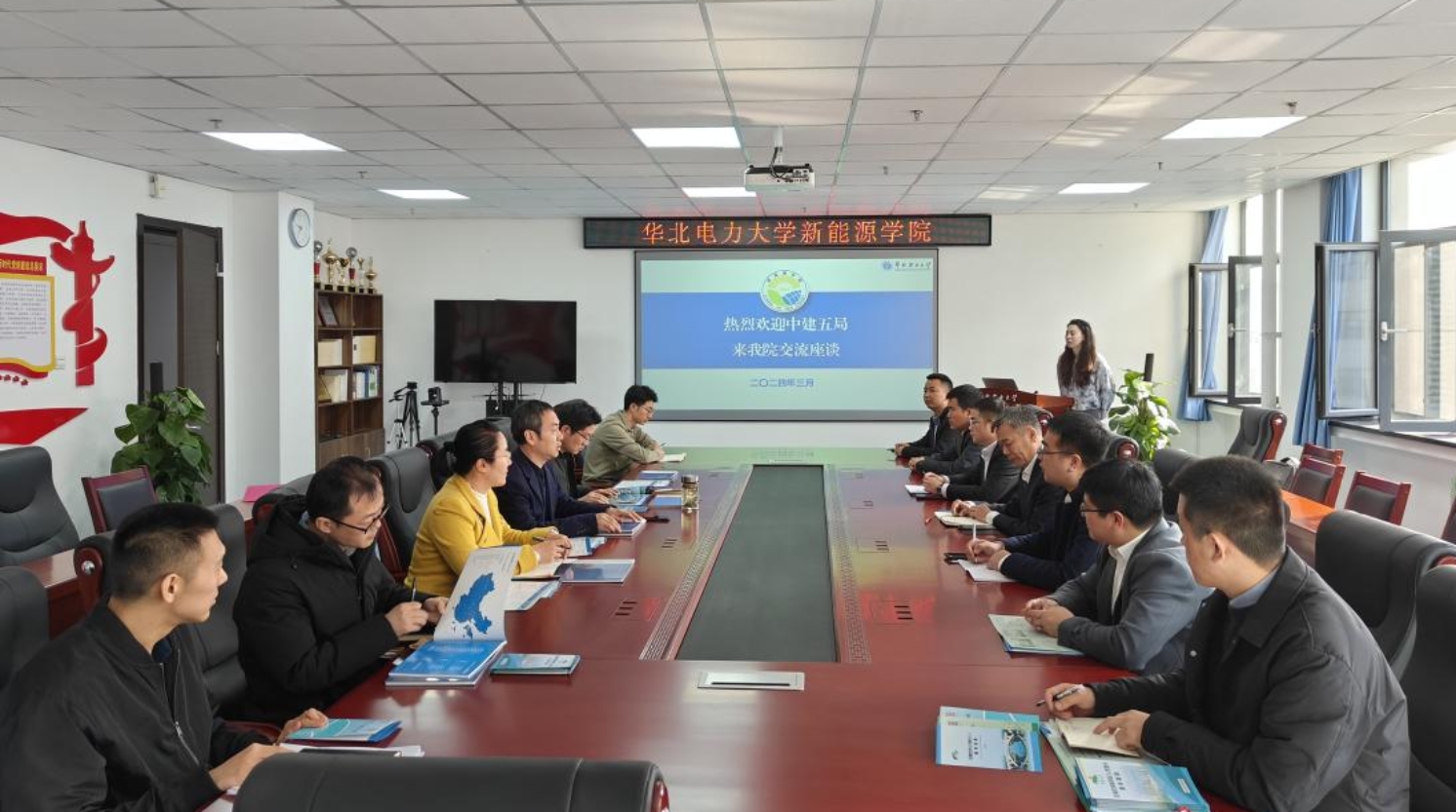 3 月 21 日上午,中建五局第四建设有限公司党委副书记/工会主席刘力、人力资源部经理郑栋飚、华北分公司副总经理杨超杰、石家庄市裕华区人才服务中心副主任王彬一行7人来到新能源学院进行座谈交流。新能源学院院长李美成、党委副书记姜良杰、能源电力创新研究院副院长宋记锋、生物质教研室主任黄耀兵、新能源材料与器件教研室教师王龙泽、团委书记黄凯兰、20级辅导员杨子发参加此次座谈会,会议由黄凯兰主持。