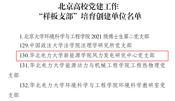近日,北京市委教育工委发布了《关于公布北京高校党建工作“标杆院系”“样板支部”“党建引领实践创新示范项目”培育创建单位名单的通知》(京教工〔2024〕47号),我校共有11个项目入选,其中我院风力发电研究中心党支部入选北京高校党建工作“样板支部”培育创建单位名单,我院智能风电场实验室研究生党支部申报的“深化支部联学共建,创新推进国家重点研发计划项目攻关”项目入选“党建引领实践创新示范项目”培育创建单位名单。